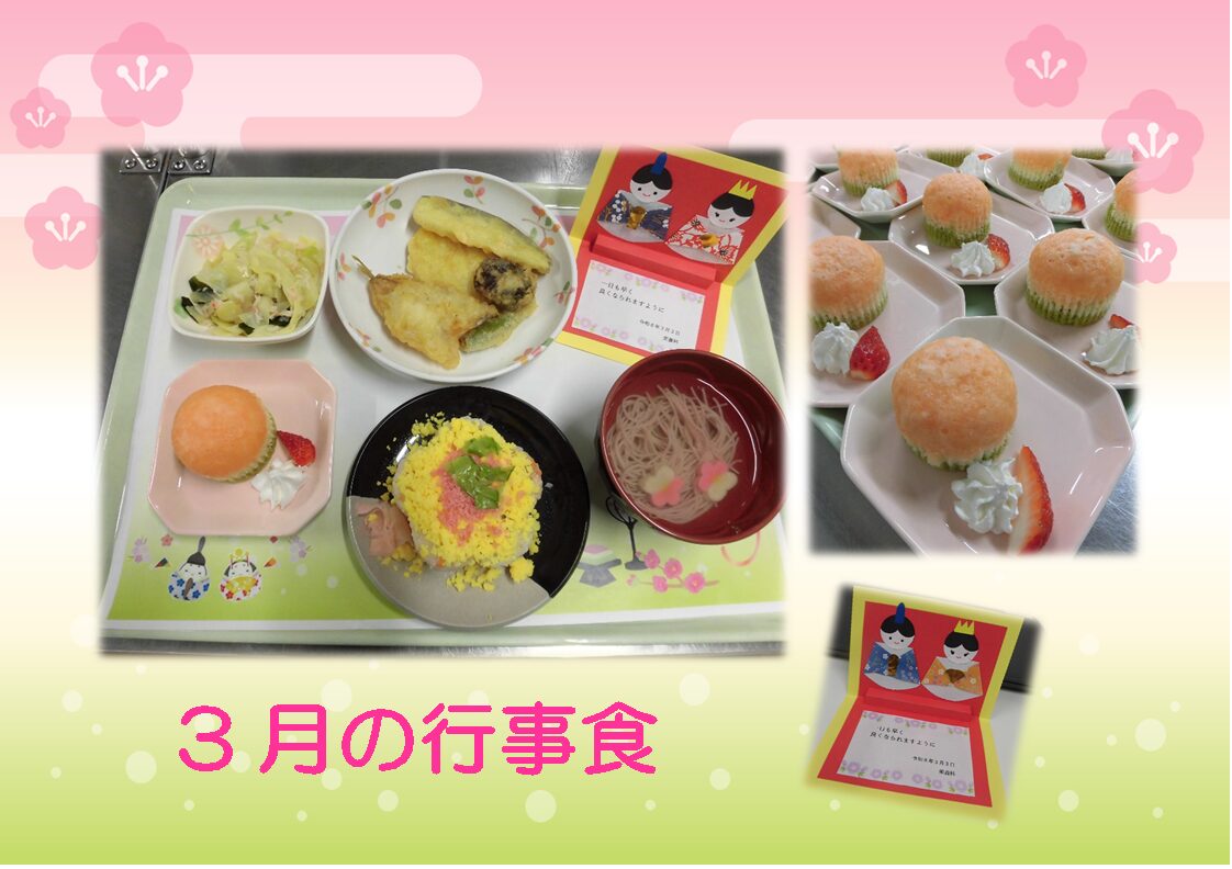 3月の行事食について 新着情報 2026.03.04 3月3日(火)昼食時に行事食を提供いたしました。 ひな祭りのお祝いとして、花型の押し寿司や桜色のそうめんを使用したすまし汁などをメニューに取り入れ、華やかになるよう工夫しました。 また、デザートには菱餅をイメージした3色蒸しパンを提供いたしました。 旬のいちごも添えることによって春らしさを感じていただける内容となりました。 メニュー 押し寿司 天ぷら キャベツの和風和え すまし汁 3色蒸しパン